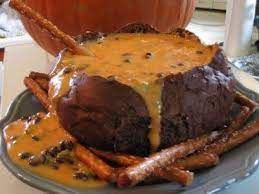 7. Spoon soup into hollowed out bread, allowing some to spill over top of bread cauldron as if bubbling, and replace top of the loaf.
