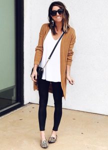 - Why It Works: The long cardigan is a cozy layering piece that adds instant style to a simple leggings-and-tunic combo. This outfit lets you stay warm and comfortable, but the draped cardigan adds a sophisticated touch.